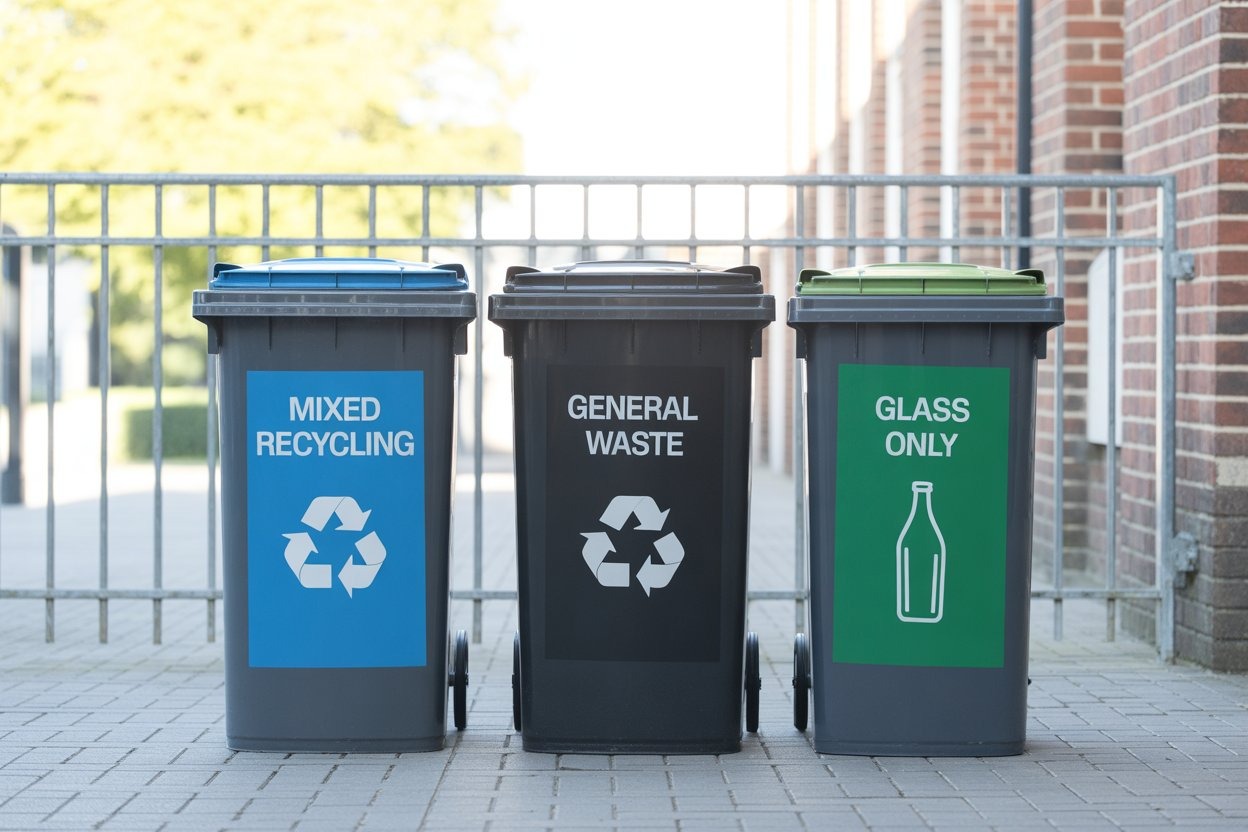 Alternative text: Outdoor recycling and waste bins with clear labels showing how businesses separate materials for effective waste segregation.